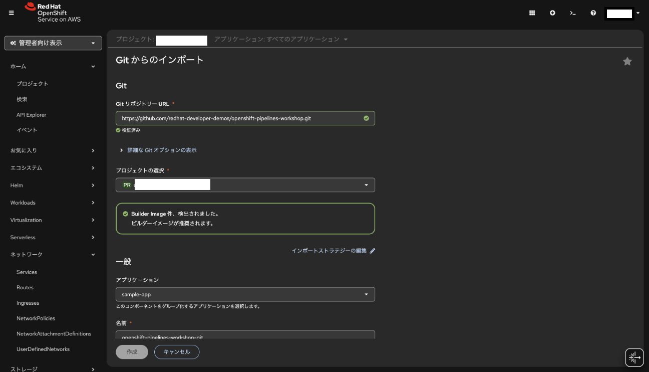 まず試したのが、Gitリポジトリからのデプロイである。Developer Sandboxの画面からGitリポジトリのURLを指定するだけで、コンテナのビルドからPod・Serviceの生成まで自動で行われる。